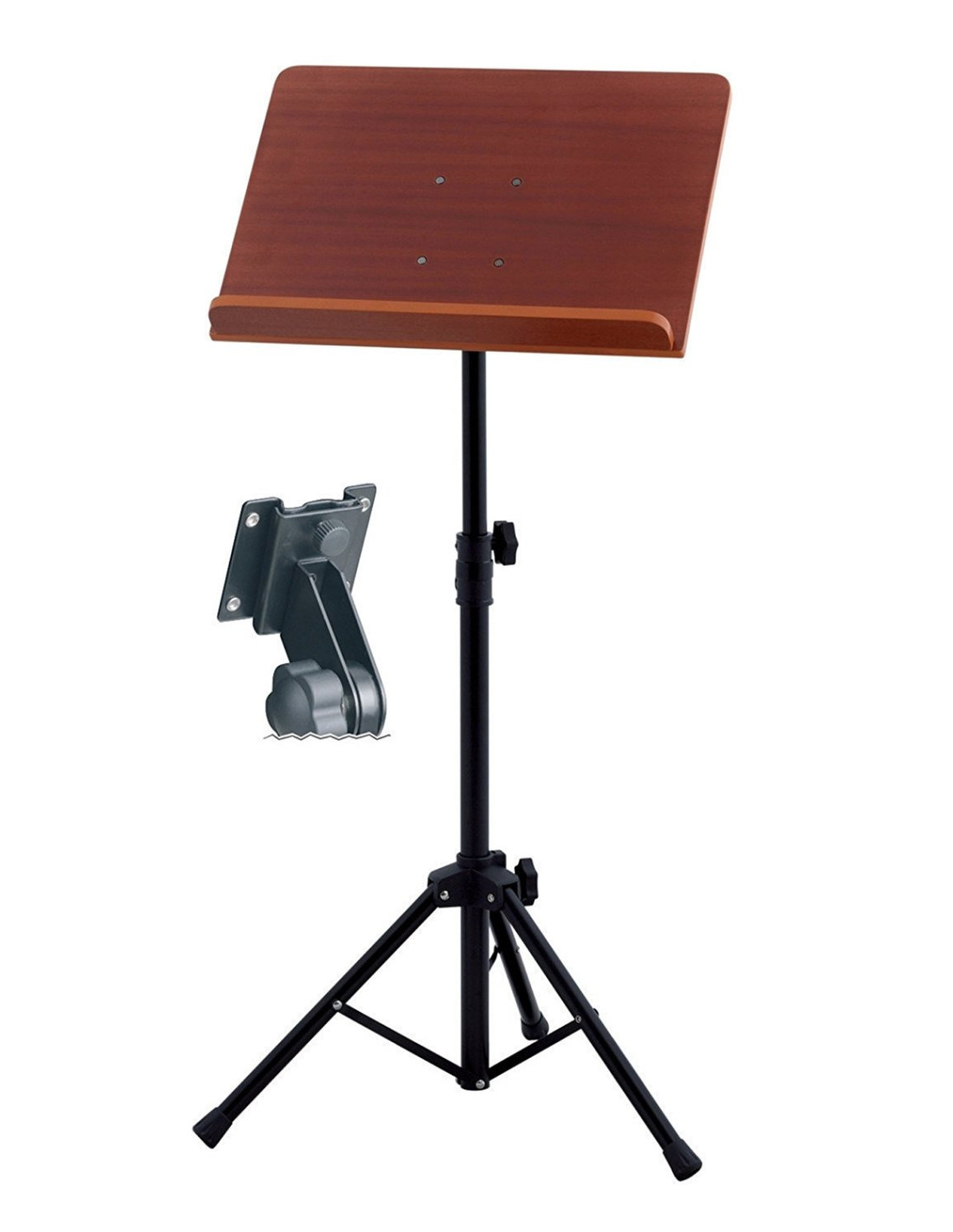 Leggìo da orchestra con tavola in legno e supporto in metallo.