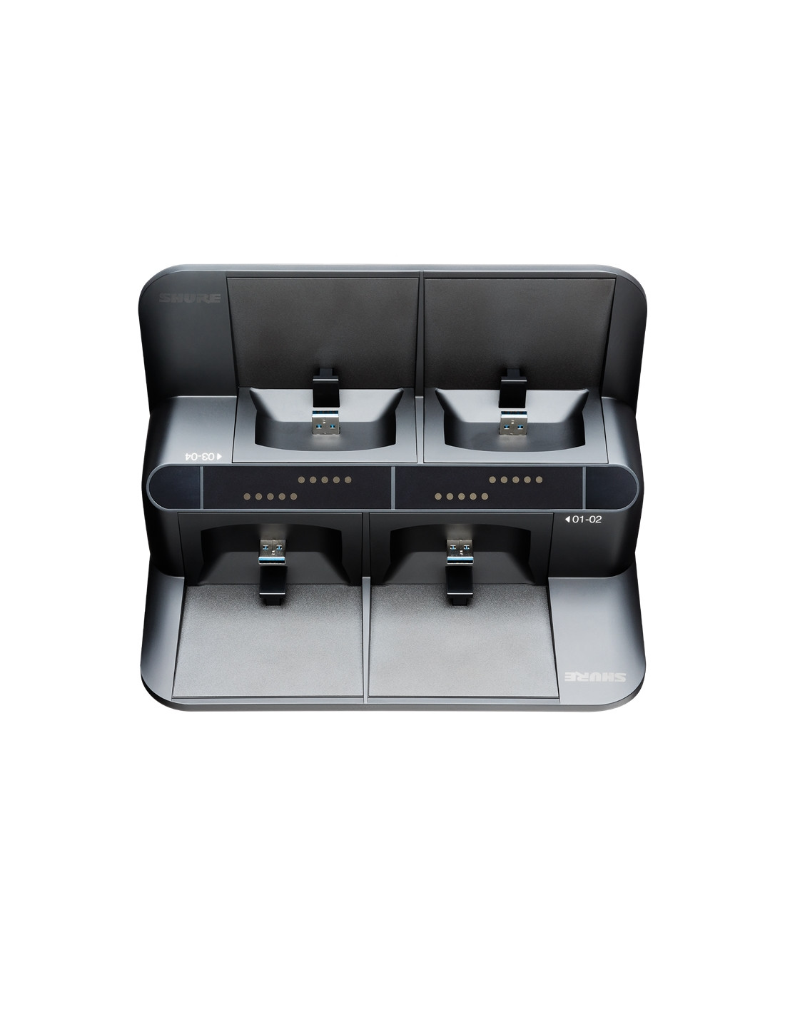 Stazione di ricarica network a 4 slot per trasmettitori ULXD6 & ULXD8 con batteria ricaricabile SB900A. La trasmittente si inserisce direttamente nella stazione, senza dover rimuovere la batteria SB900A.