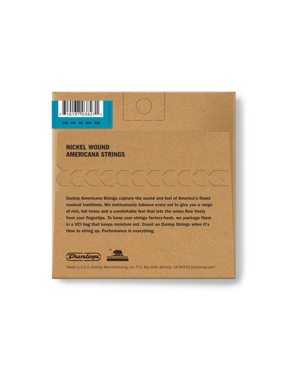 Le corde Dunlop Americana Strings catturano il suono della tradizione musicale americana. Queste corde sono bilanciate per renderle confortevoli da suonare, offrendo un range di frequenze ricco. Le corde Dunlop sono realizzate in California con l'aiuto dei feedback di grandi musicisti da tutto il mondo. Le macchine vengono fatte lavorare più lentamente, producendo lotti più piccoli ma che garantiscono un maggior controllo in ogni fase del processo. Vengono poi sigillate in modo da garanirne la freschezza e la durata.