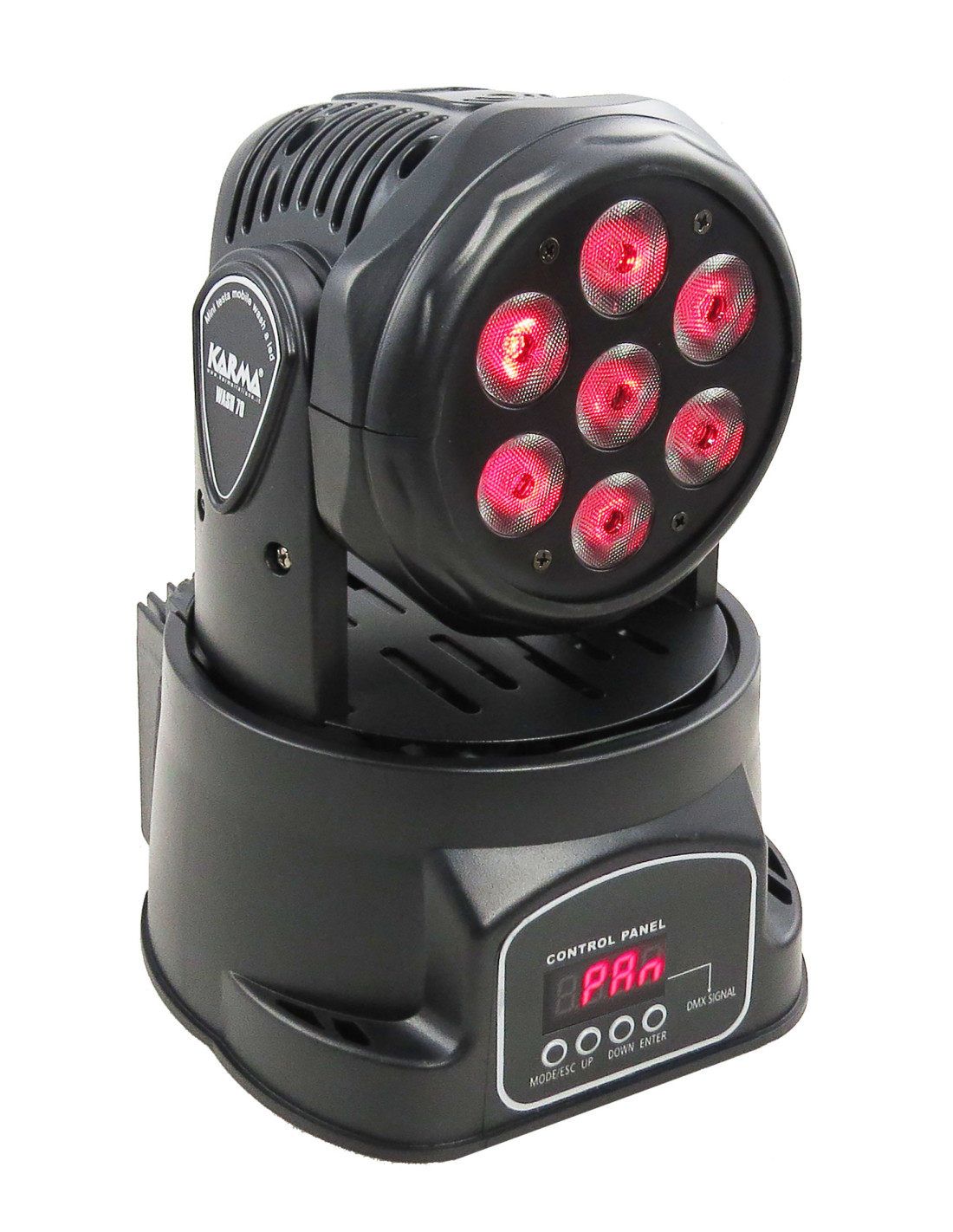 Piccola ma potente testa mobile KARMA | TM WASH 70 | Wash Moving head è in grado di generare fasci luminosi particolarmente intensi grazie ai suoi 7 led da 10W. Ogni led può illuminarsi in 4 colori (RGBW) permettendo di ottenere ogni tipo di tonalità desiderata.